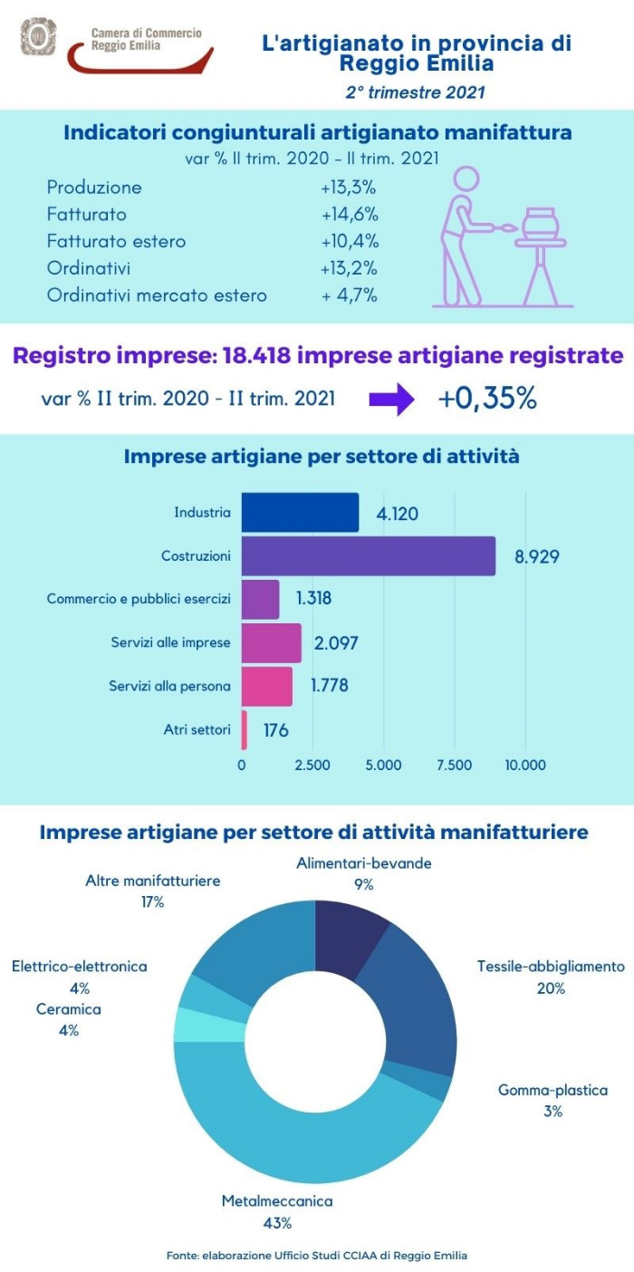 C’è ancora molto terreno da recuperare dopo la pesante flessione del 2020, ma nel secondo trimestre del 2021 per l’artigianato reggiano la crescita è tornata a doppia cifra: le analisi dell’Ufficio studi della Camera di commercio di Reggio, infatti, hanno certificato un aumento della produzione pari al 13,3%, alla quale si sono associati segni positivi anche per quanto riguarda il fatturato (+14,6%) e gli ordinativi (+13,2%).