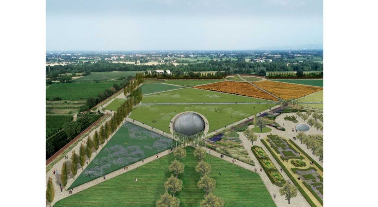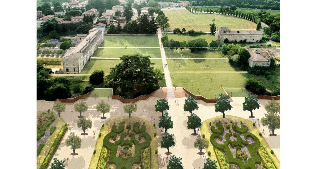 La scalinata, in particolare, consente la discesa dalla Corte ducale al Parco, poggiando all’estremità inferiore sul limitare del Parterre, che verrà ricostituito nelle forme settecentesche. Nell’area del Parterre e del Parco – questa un’ulteriore novità – rimarranno conservati i filari o gruppi di Gelsi.