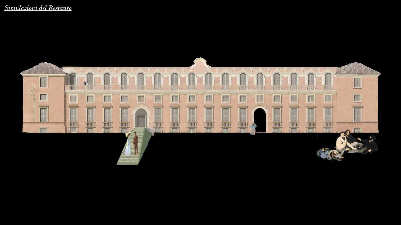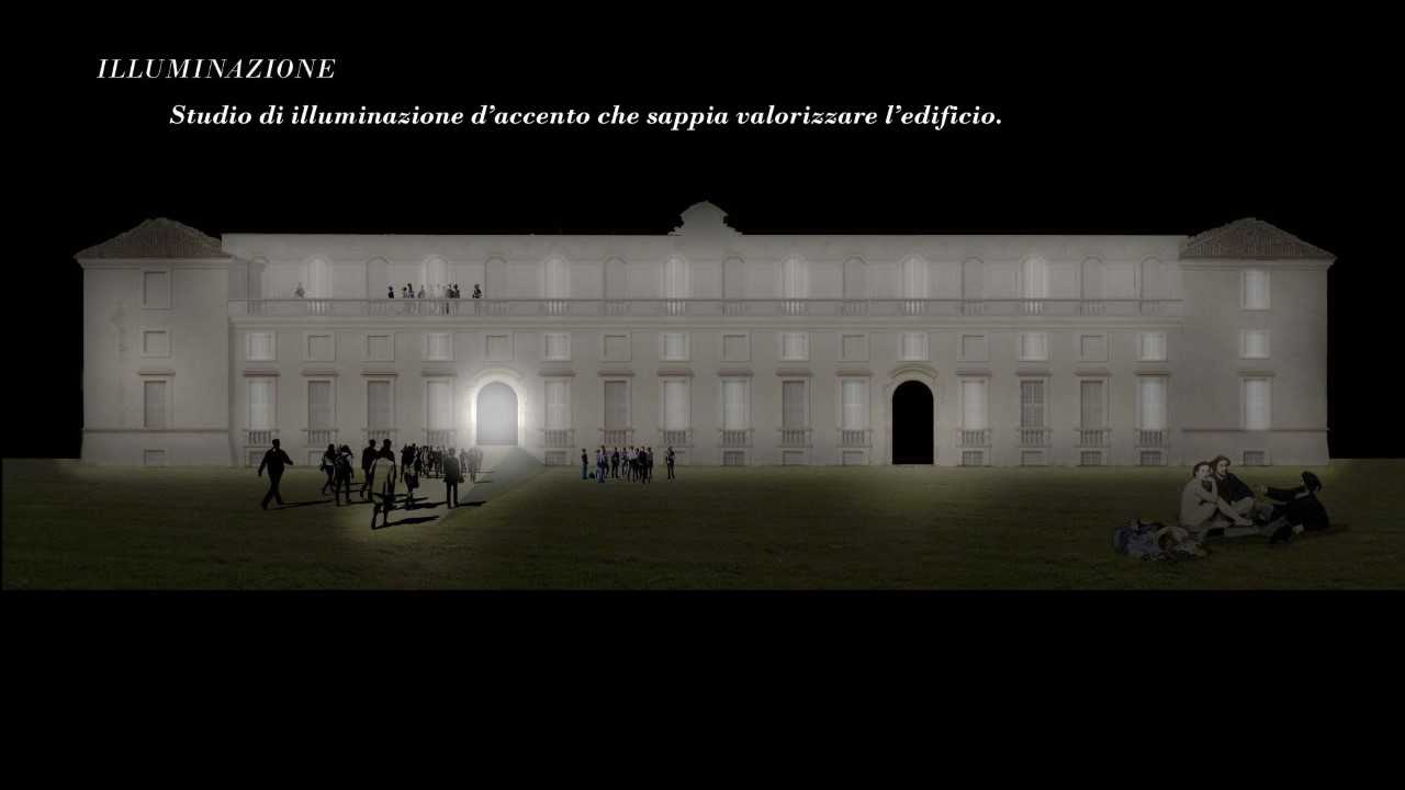 In particolare, nelle superfici esterne sarà rimosso l’intonaco ove strettamente necessario e sostituito con malte di calce e di inerti simili a quelli esistenti. Ripristinata la continuità dell’intonaco, si procederà al ripristino della cromia originale impiegando coloriture composte da calce e pigmenti naturali. Gli elementi compromessi delle balaustre e i laterizi sagomati saranno sostituiti con elementi appositamente ricostruiti con forma e materiali simili agli originali. Le decorazioni plastiche in stucco saranno restaurate, ripristinando la continuità materica nelle forme e dimensioni originali. La riapertura delle finestre tamponate e il ripristino delle tamponature dipinte esistenti in origine rappresenta il principio che guiderà il recupero delle facciate nord, est ed ovest a ricostruire la regolarità e l’eleganza scenografica che caratterizzavano l’edificio nel suo stato originale;