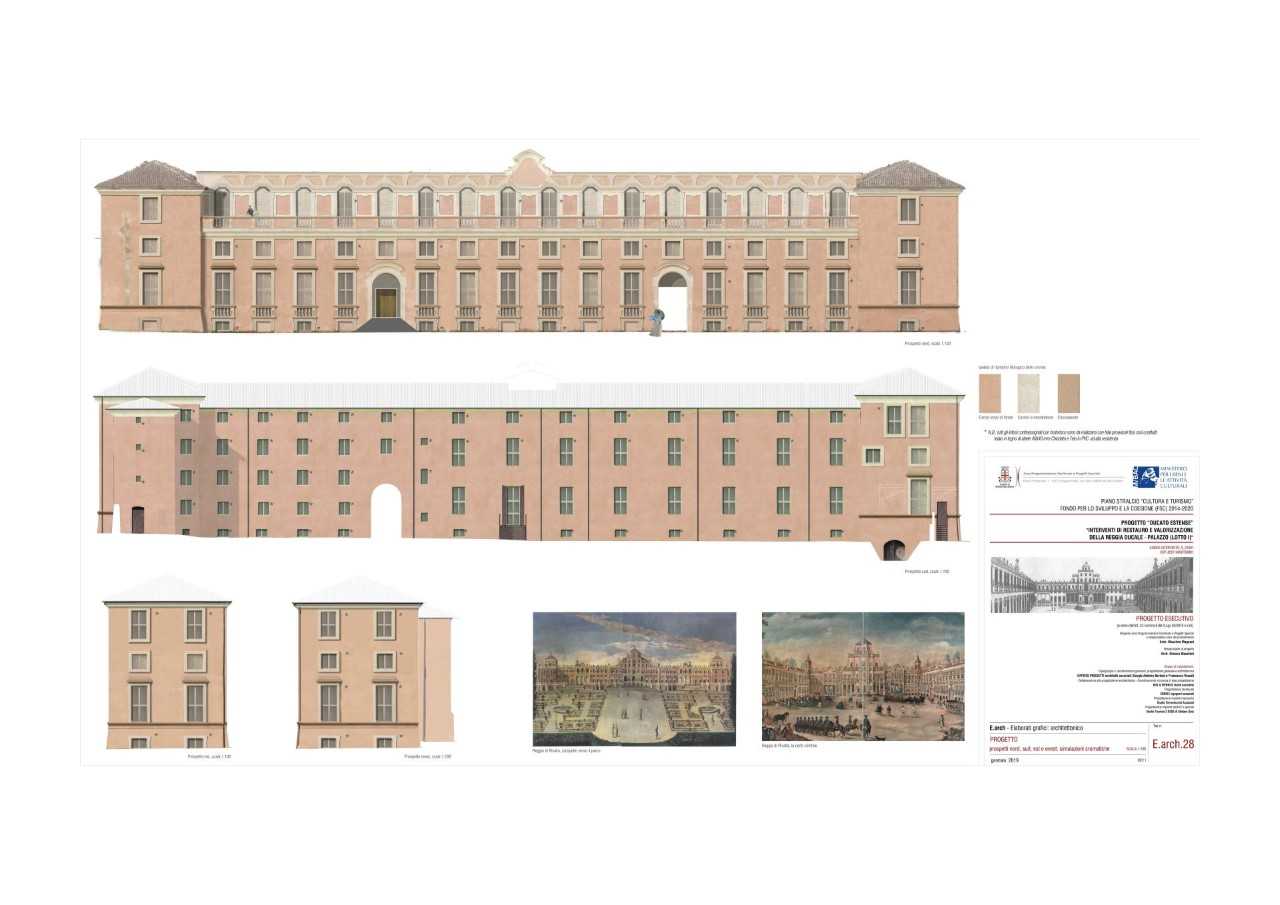 Per quanto riguarda il Palazzo, il ‘Cantiere estense’, nell’ambito del Primo stralcio di lavori, si concentrerà sul consolidamento antisismico delle strutture, sulla realizzazione delle principali dotazioni impiantistiche e sul restauro delle facciate; al Piano nobile, parte est e Torrione est, si prevede inoltre la realizzazione e il completamento delle opere di restauro che interessano fra l’altro le pareti interne, i dipinti e gli intonaci, i pavimenti, le finiture, le dotazioni impiantistiche (elettriche, meccaniche, idriche e antincendio) e il miglioramento della accessibilità degli spazi a tutti, con puntuale superamento delle barriere architettoniche e percorsi adeguati.