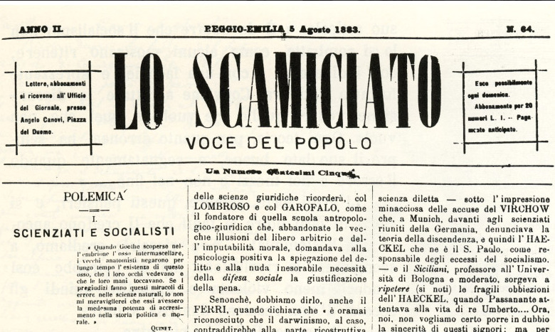 Nel gennaio 1882 usciva a Reggio Emilia il giornale anarco-socialista: Lo Scamiciato, voce del popolo. Anarchico perché comprendeva aderenti alla Prima Internazionale come Angelo Canovi (amministratore), Arturo Ceretti, Celso Pasini, Vincenzo Beggi, Cesare Masoni (Redattore responsabile), Luigi Bondavalli (tipografo), Angelo e Carlo Pedemonti, Cesare Bedogni, Benedetto Gorisi, Giovanni Ferrarini, Ugo Rabbeno, socialista perché vi scriveva anche chi era più sensibile alle idee evoluzioniste e socialiste, che si stavano diffondendo in Italia. Fra questi Camillo Prampolini. Né gli uni né gli altri avevano, in realtà, ancora un’idea chiara dei connotati che la società socialista avrebbe avuto nel futuro.