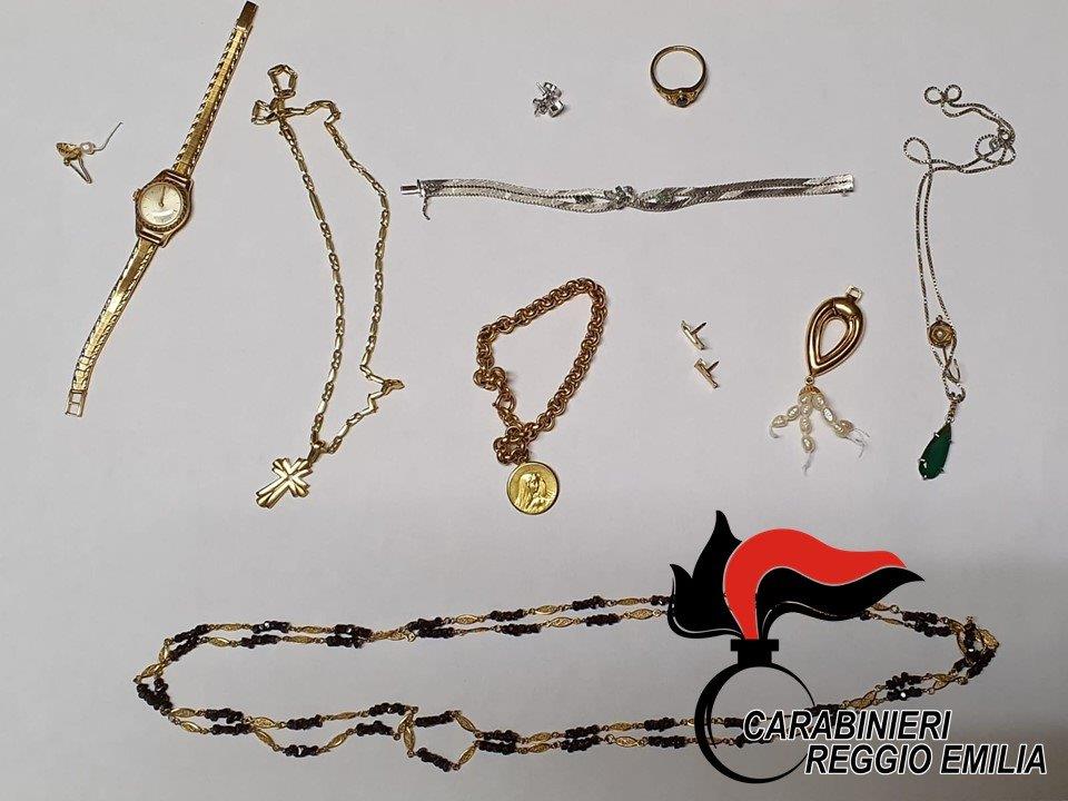 Progetto non riuscito in quanto i carabinieri di Quattro Castella durante le ricerche hanno rinvenuto e recuperato la refurtiva costituita da preziosi e monili in oro per un valore stimato in 50.000 euro. Tra i preziosi recuperati dai carabinieri, oltre ai gioielli trafugati all’anziano reggiano, anche altri monili in oro la cui provenienza furtiva è al vaglio dei carabinieri. Dentro l’autovettura, munita di targhe clonate, i carabinieri hanno rinvenuto svariati attrezzi da scasso per aprire casseforti, tre pettorine con la scritta polizia locale, un jammer disturbatore di frequenze per cellulari onde impedire agli anziani di chiedere aiuto e un apparato radio sintonizzato sulle frequenze di polizia e carabinieri, una paletta della protezione civile, 300 euro in contatti e vari spray al peperoncino utilizzati nei colpi per disorientare le vittime. Tre ladri professionisti quelli intercettati dai carabinieri di Quattro Castella alle porte di Reggio che ora i militari stanno cercando di identificare.