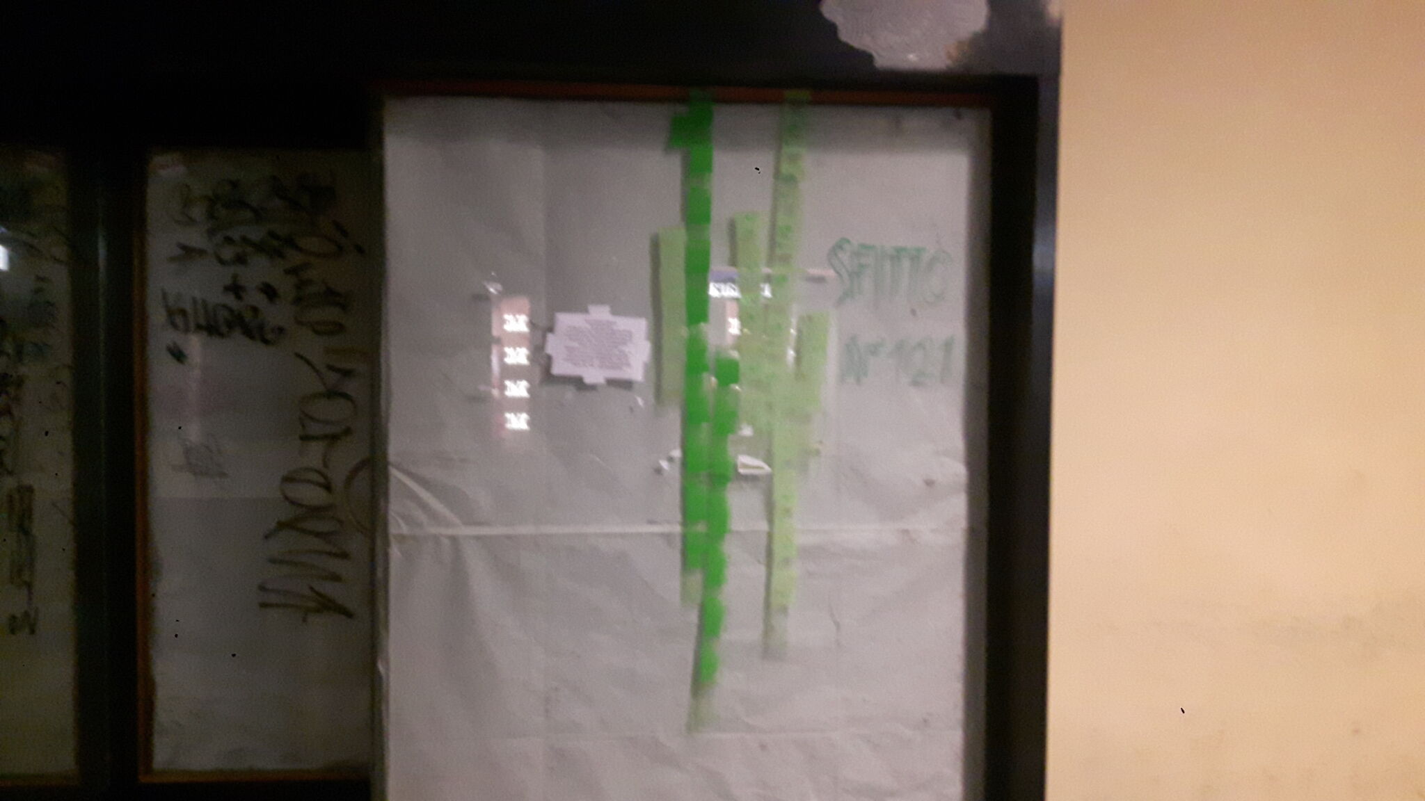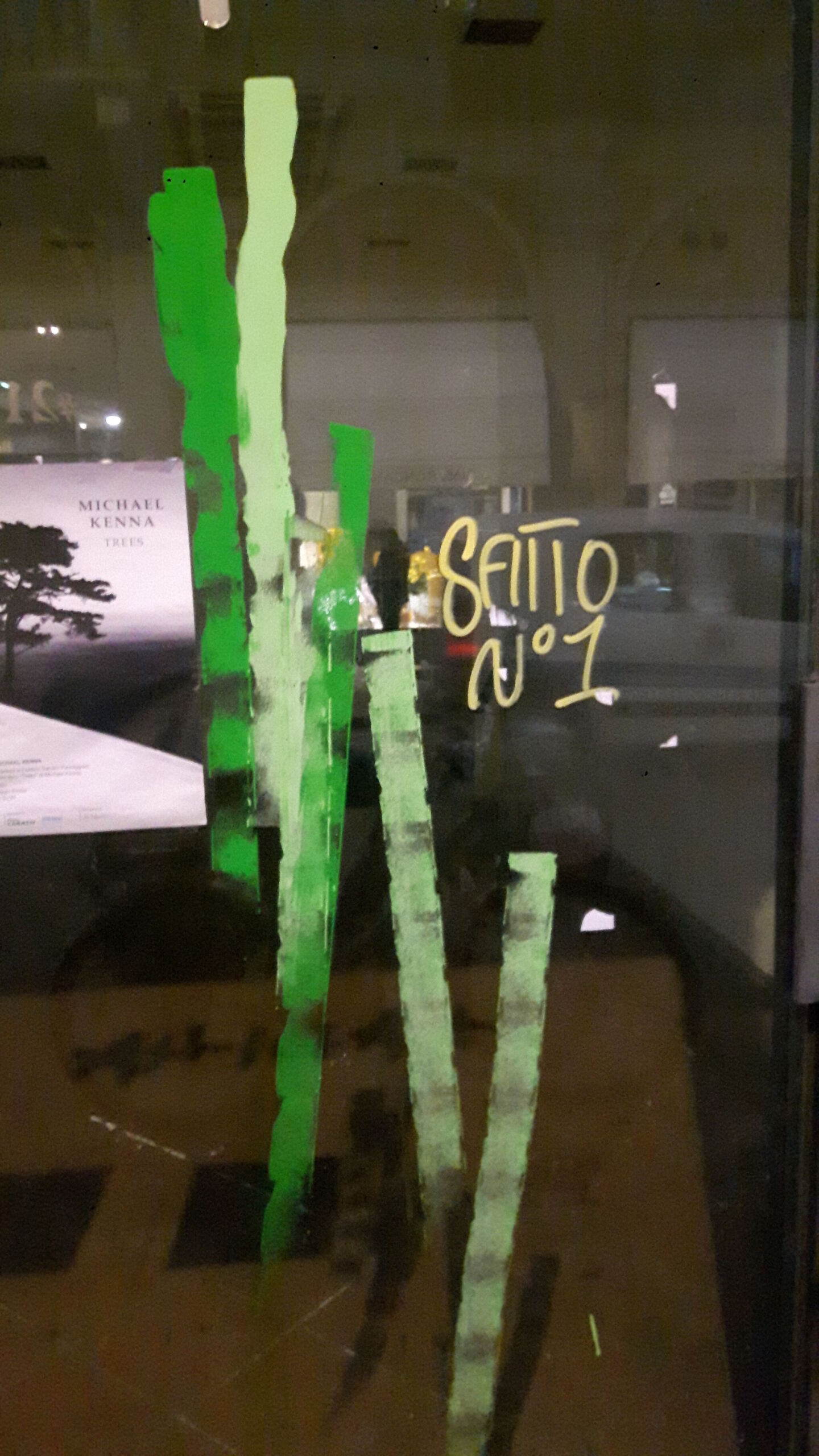 Raid nella notte tra lunedì 24 e martedì 25 aprile. Segni verdi sono spuntati come funghi la mattina della liberazione sulle vetrine spente dei negozi vuoti, a segnalarne il numero. La vetrina numero 1 (sulla quale appare una macchia somigliante a un bambù stilizzato in varie sfumature di verde) è segnalata in via Emilia San Pietro, quasi di fronte all’imboccatura di via Roma. Mentre la 121, solito segno, resta sotto i portici di San Pietro, così come sono state marchiate anche le bacheche affisse alle colonne del porticato.
