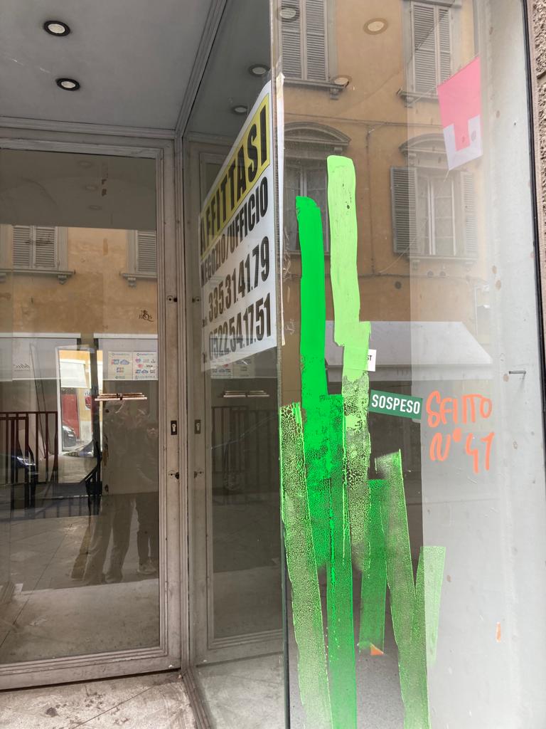 Vernice spray usata con tecnica stencil, anche lavabile? Pare di sì. Il segno resta all’esterno del vetro e grattandolo con il dito, schiarisce. Abbiamo avvistato le strisce verdi anche in via Crispi, in via Carducci, in Piazza Prampolini e lungo tutta via Emilia Santo Stefano fino alla Porta e in Corso Garibaldi .