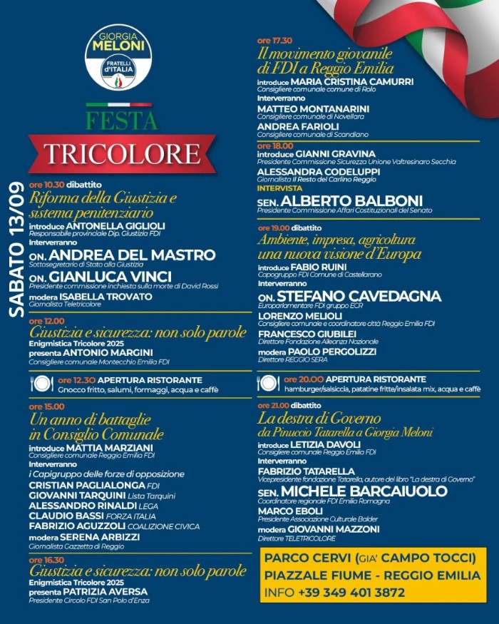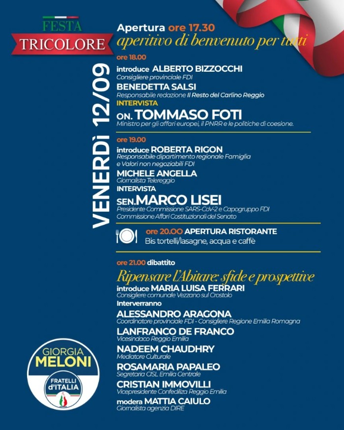 Si chiama “Festa Tricolore” la festa provinciale di Fratelli d’Italia, in programma nelle giornate di venerdì 12 e sabato 13 settembre al parco Cervi (ex Campo Tocci) di Reggio, in piazzale Fiume: “Un momento importante – spiegano gli organizzatori – per dibattere e condividere riflessioni sulla politica locale e nazionale”.
