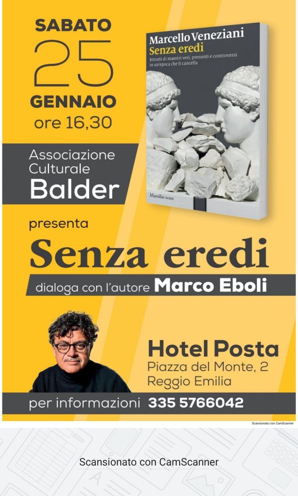 Scrive in una nota Marco Eboli, presidente dell’Associazione Balder di Reggio Emilia: “L’Associazione culturale “Balder”, che ho l’onore di presiedere, organizza per sabato 25 gennaio, ore 16.30, presso la Sala del Capitano del Popolo dell’hotel Posta (piazza del Monte, a Reggio Emilia, ingresso libero), la presentazione dell’ultimo libro dello scrittore e giornalista Marcello Veneziani dal titolo ‘Senza eredi”.