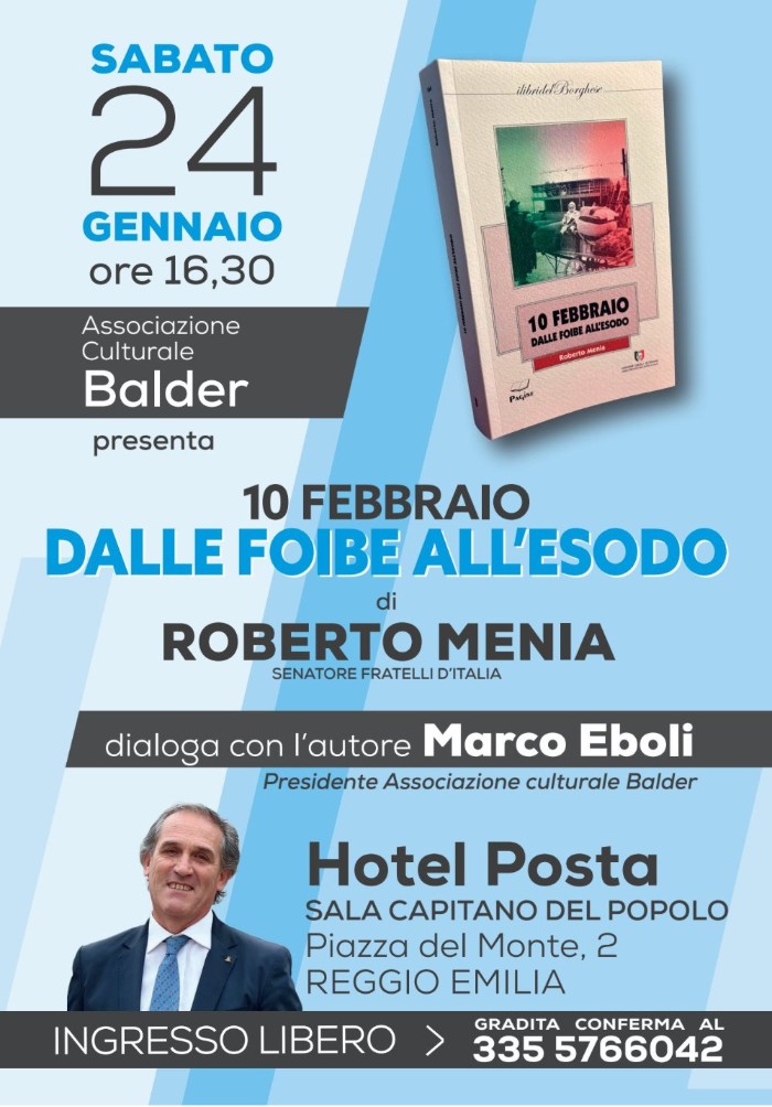 Sabato 24 gennaio alle 16.30 nella Sala del Capitano del popolo dell’hotel Posta, a Reggio, è in programma la presentazione del libro “10 febbraio – Dalle foibe all’esodo”, scritto dal senatore di Fratelli d’Italia Roberto Menia e giunto alla terza edizione. A dialogare con l’autore sarà Marco Eboli, presidente dell’associazione culturale reggiana Balder. L’ingresso all’iniziativa è libero.