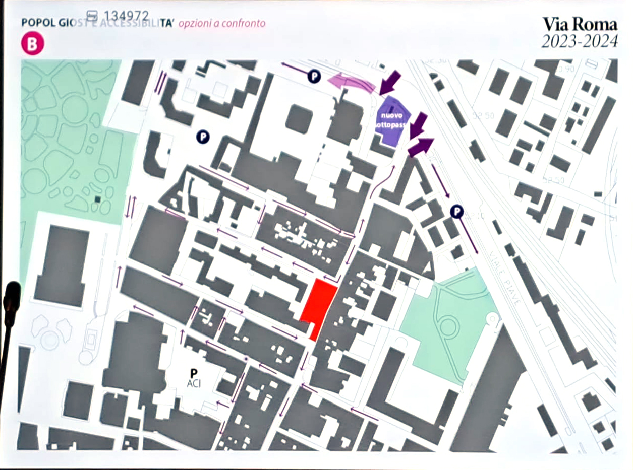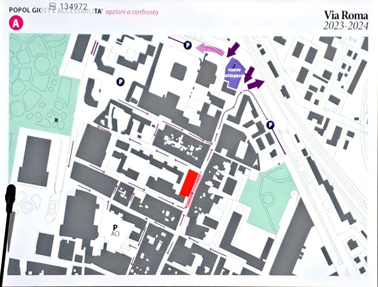 La seconda soluzione prevede invece la strada chiusa per ampliamento della “Piasa dal Popol Giost” con conseguente modifica complessiva della viabilità e l’annullamento di tutti i parcheggi sia sulla piazza sia lungo via Roma.