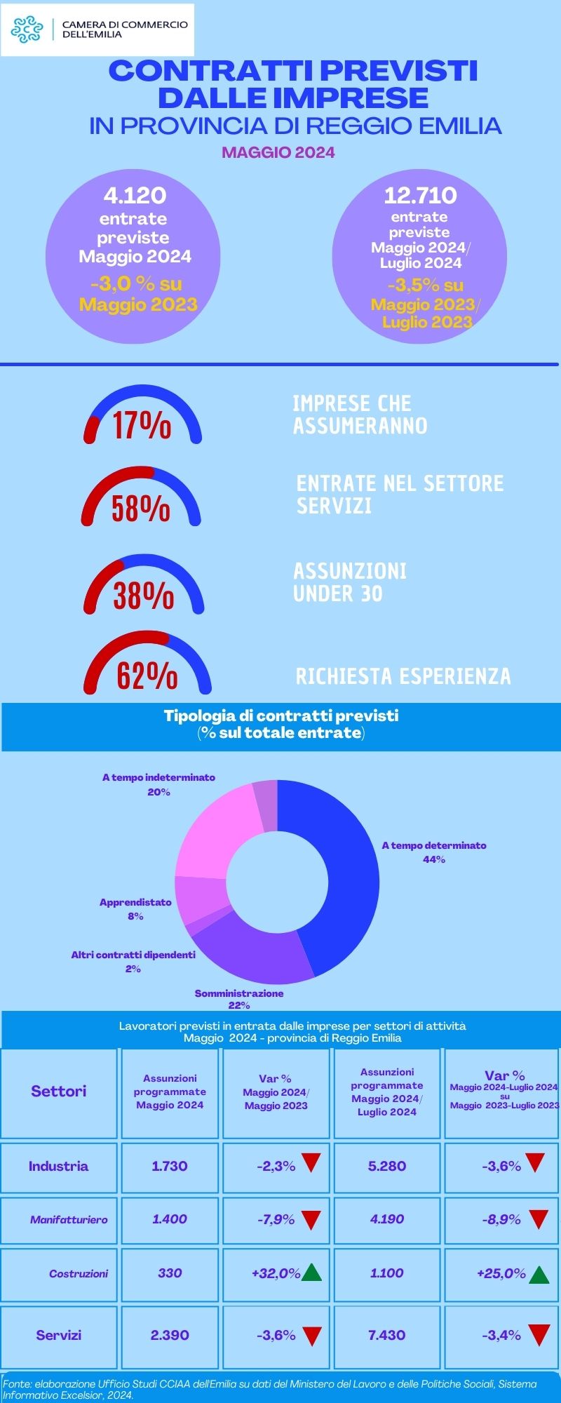 I primi 5 settori di attività per nuovi contratti programmati nel mese di maggio sono il commercio (590 unità, + 15,7% ), i servizi di alloggio e ristorazione e turistici (580 nuovi contratti, con un ‑12,1% rispetto al maggio 2023), le industrie meccaniche ed elettroniche (510 nuovi contratti, ‑15%), le industrie metallurgiche e dei prodotti in metallo (350 nuovi contratti, -5,4%) e le costruzioni (330 unità, +32%).