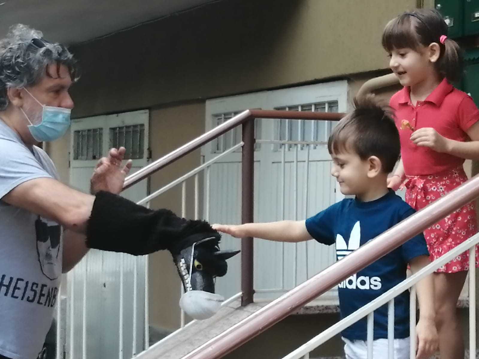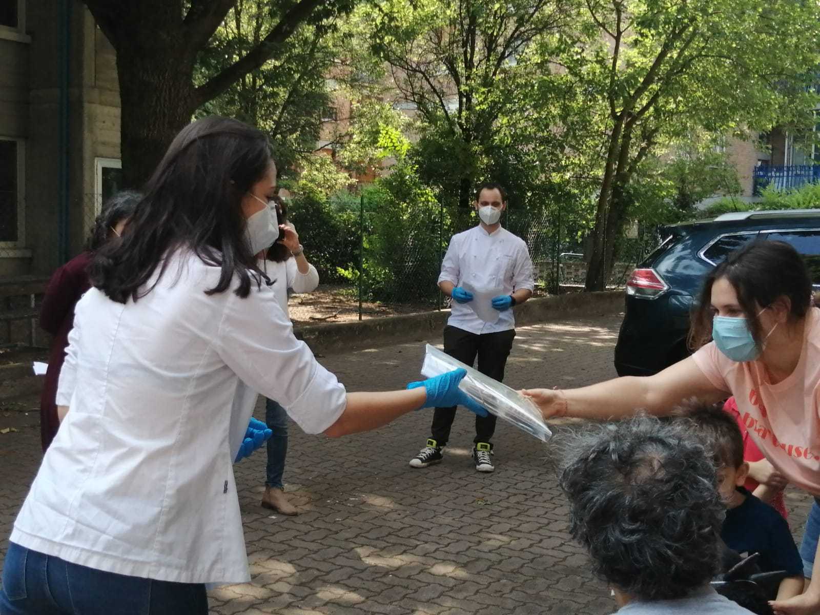 Si è così voluto dare un segno di concreta vicinanza, pur mantenendo distanziamento fisico, mascherine e guanti. Una piccola troupe di cuochi, educatori e animatori, si è messa in moto raggiungendo le famiglie sotto casa. “Ti porto Cucina di Quartiere – Ingredienti per nuove storie” è stata una sorta di performance itinerante, un incontro diretto ma distanziato, tra strada, finestra, balcone o giardino, per non disperdere la relazione con bambini e genitori, per raccontare storie e filastrocche legate ai temi del cibo e della condivisione. E’ stato anche consegnato, come segno concreto, un kit con filastrocche, libro-teatrino per burattini, spezie come cannella o curcuma, noce moscata “che non vola e non ronza”, legumi da piantare, mandorle e altri sapori.