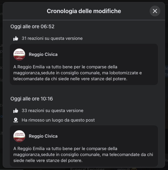 Reggio Civica: “In consiglio comparse lobotomizzate e telecomandate”, poi cambia il post