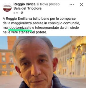È polemica a Reggio per un post pubblicato martedì 28 ottobre sulla pagina Facebook della lista civica Per Reggio Emilia, in cui i consiglieri comunali della maggioranza in Sala del Tricolore venivano definiti “comparse della maggioranza, sedute in consiglio comunale, ma lobotomizzate e telecomandate da chi siede nelle vere stanze del potere”.