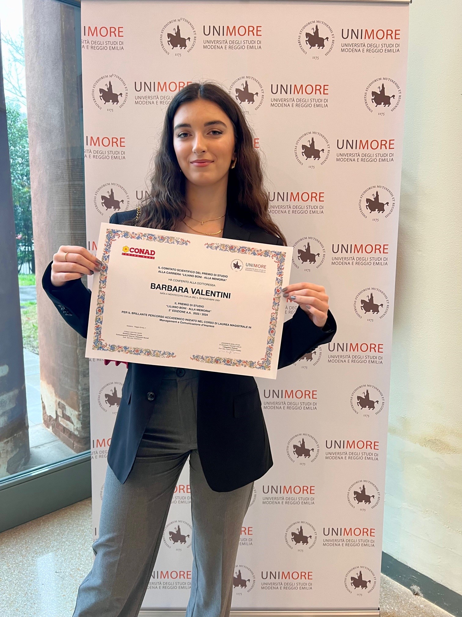 Conad Centro Nord ha consegnato il primo dei due Premi di Studio alla Carriera “Liliano Boni” ad una studentessa della laurea triennale in Marketing e Organizzazione d’Impresa di Unimore. Il Premio è stato istituito nel 2019 in memoria di uno dei più stimati dirigenti del gruppo distributivo, Liliano Boni, che è stato a lungo Direttore Commerciale e Marketing della società cooperativa.