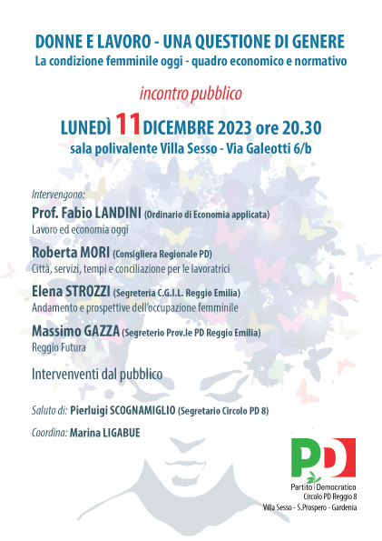 Intervengono: Fabio Landini, professore Ordinario di Economia Applicata che affronterà il tema del lavoro ed economia oggi, Roberta Mori, consigliera Regionale Pd, che parlerà di città, servizi, tempi e conciliazione per le lavoratrici, Elen Strozzi della segreteria Cgil Reggio Emilia sull’andamento e prospettive di lavoro, Massimo Gazza, segretario provinciale Pd sul futuro di Reggio Emilia.