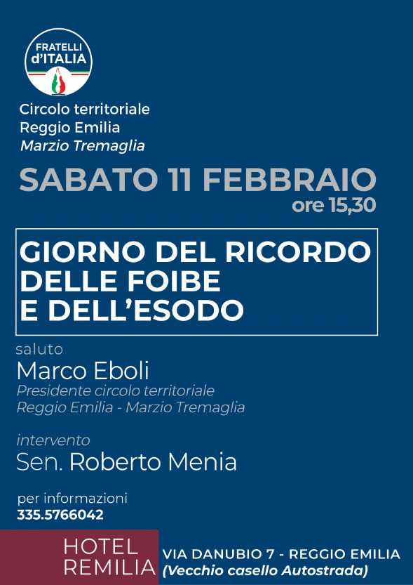 Sabato 11 febbraio, alle 15.30, Hotel Remilia (nei pressi del vecchio ingresso autostrada), su invito di Marco Eboli, presidente del Circolo territoriale di Reggio Emilia “Marzio Tremaglia”, il senatore Roberto Menia, a cui si deve l’approvazione della legge 92 del 30/3 /2004, istitutiva del Giorno del Ricordo, terrà una conferenza sul tema.