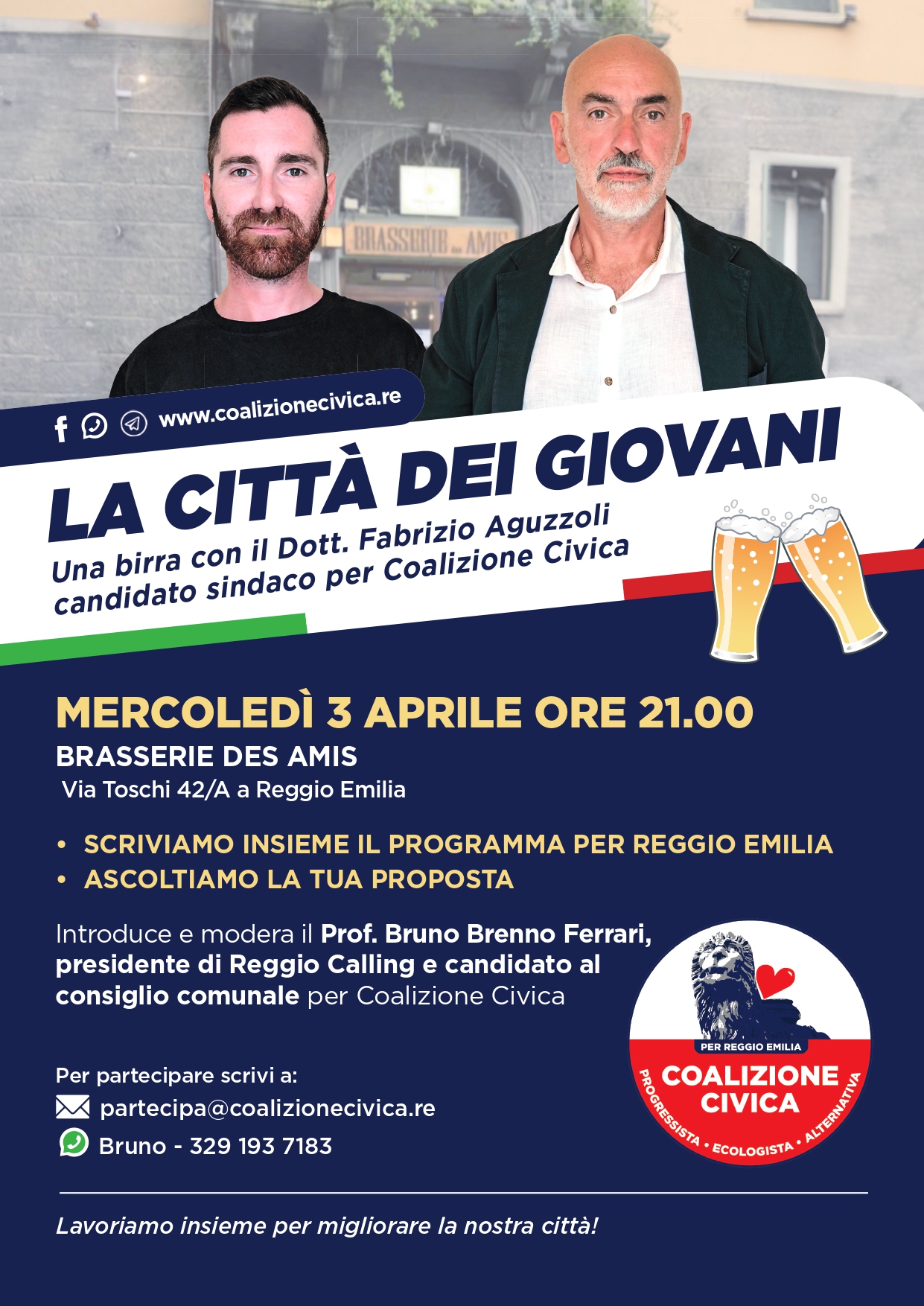 La serata informale di confronto si terrà mercoledì 3 aprile, alle 21 alla birreria Brasserie Des Amis in via Toschi 42/A a Reggio Emilia. A guidare l’incontro sarà Bruno Brenno Ferrari, insegnante nelle scuole reggiane, presidente dell’associazione culturale Reggio Calling, da tanti anni impegnato in prima persona in progetti che coinvolgano le fasce più giovani della popolazione e candidato per il consiglio comunale con Coalizione Civica. Con Ferrari e Aguzzoli, saranno presenti Dario De Lucia, l’altro consigliere in carica di Coalizione Civica, e diversi esponenti della formazione.