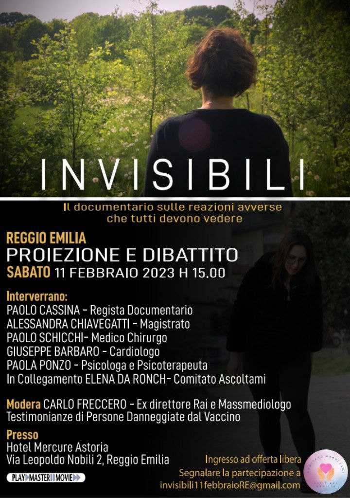 mi rivolgo a Lei per un appello da parte degli organizzatori della proiezione del documentario “Invisibili”, per chiedere la sua preziosa partecipazione. La sua presenza darebbe al dibattito il significato importante di aiuto della comunità ad una minoranza che, purtroppo ed in buona fede, è stata danneggiata dal vaccino. Queste persone hanno creduto nel bene comune. È compito di tutti mostrare gratitudine e solidarietà nei loro confronti.