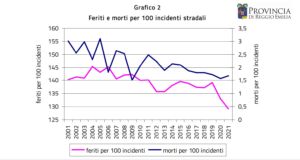 Dal 2001 al 2021, a fronte di un considerevole aumento di veicoli circolanti – da 370.877 a 470.206, soprattutto autovetture (+64.567, +22,4%) e motocicli (+25.294, +78,6%) – in provincia di Reggio Emilia si è più che dimezzato (da 3.684 a 1.548) il numero di incidenti stradali con lesioni alle persone, e sono drasticamente diminuiti anche i decessi, passati dai 111 del 2001 ai 26 del 2021 (-77%). In costante calo dal 2001 anche il numero dei feriti, scesi da 5.170 a 1.998 (-61%).
