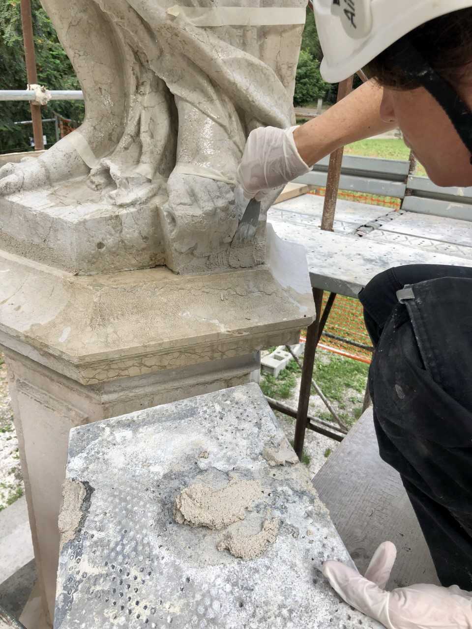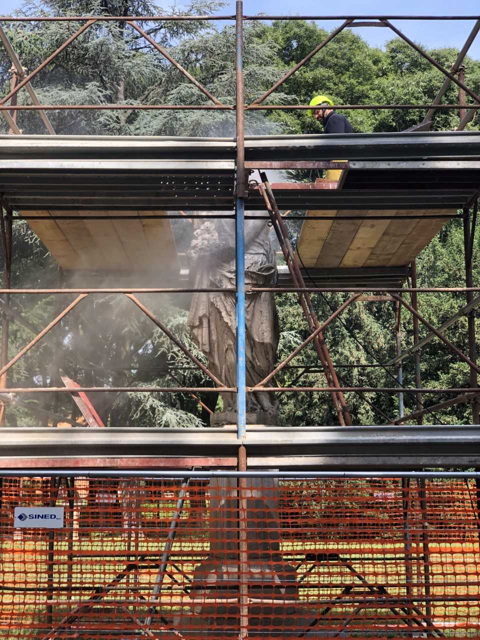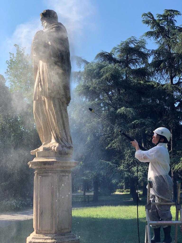 Si è quindi deciso di procedere alla pulitura, prima del trasferimento dal parco al viale, e al restauro delle quattro sculture, che nella sua parte più delicata sarà completato lungo il viale stesso.