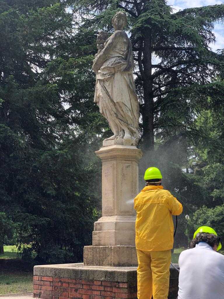 ANALISI, PULIZIA E RESTAURO CONSERVATIVO – Fin dal primo sopralluogo di tecnici e restauratori al parco del Popolo, era stato rilevato che le quattro sculture presentavano uno stato conservativo mediocre, con diffuse patine biologiche e qualche punto lievemente sfaldato per il dilavamento naturale del materiale lapideo.