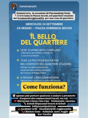 Alle 18 è previsto il laboratorio per bambini e bambine “Playing with complaint” (“Giocare con le lamentele”), a cura di Cocreiamo, per riprogettare uno spazio pubblico adatto a tutti partendo proprio dalla prospettiva dei più piccoli. Alle 19, invece, spazio a “Le politiche educative nel contesto del Quartiere stazione”, un dialogo (a cura di Rete di comunità Impossibile) con Marwa Mahmoud, assessora alle politiche educative del Comune di Reggio, sulle azioni già avviate e sulle prospettive future, con la partecipazione delle volontarie del doposcuola Il Portico di via Turri 27. A seguire, infine, ci sarà una “cena comunitaria” in piazzetta Secchi, sempre a cura della Rete di comunità Impossibile, in cui ognuno è invitato a portare qualcosa da condividere.