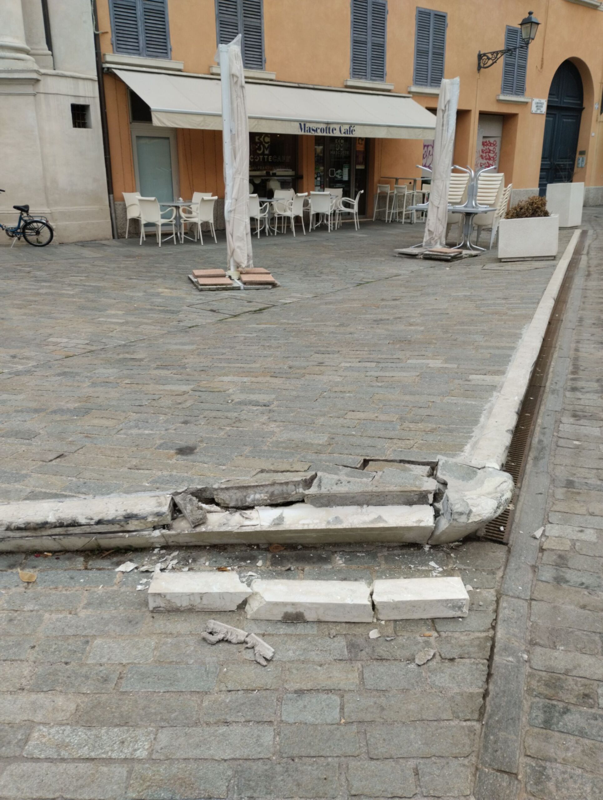 Per l’ennesima volta colpito e distrutto il cordolo del marciapiede di piazzale Roversi. Un lettore ci segnala che la pavimentazione in rilievo e sporgente antistante l’antica chiesa del Cristo ancora una volta è stata sgretolata da un urto. Ormai non si contano più le riparazioni eseguite sul selciato, tra l’altro appena rinnovato, nel tratto che da Corso Garibaldi conduce a Porta Castello. La sporgenza viva, la sera poco illuminata, trae in inganno gli automobilisti che vi transitano e in innumerevoli casi è stata centrata e sgretolata, provocando danni, è facile immaginarlo, anche alle vetture che finiscono per sbattervi contro.