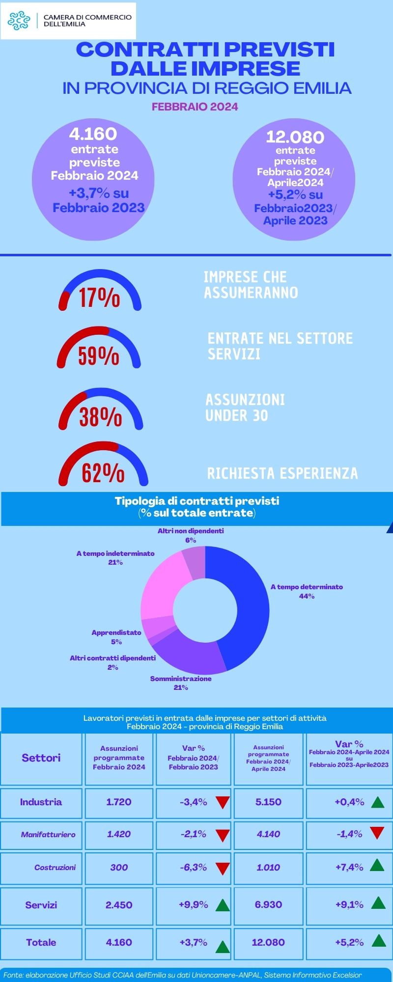 Per febbraio, infatti, sono previsti 4.160 nuovi contratti in provincia di Reggio Emilia nel corso del mese di febbraio; il dato – che emerge dall’analisi dell’Ufficio studi della Camera di commercio dell’Emilia sui dati del Sistema Excelsior – appare in crescita (+3,7%) rispetto al mese di febbraio 2023.