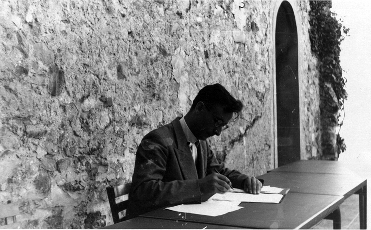 Giuseppe Dossetti al tavolo di lavoro, prepara il discorso di Rossena