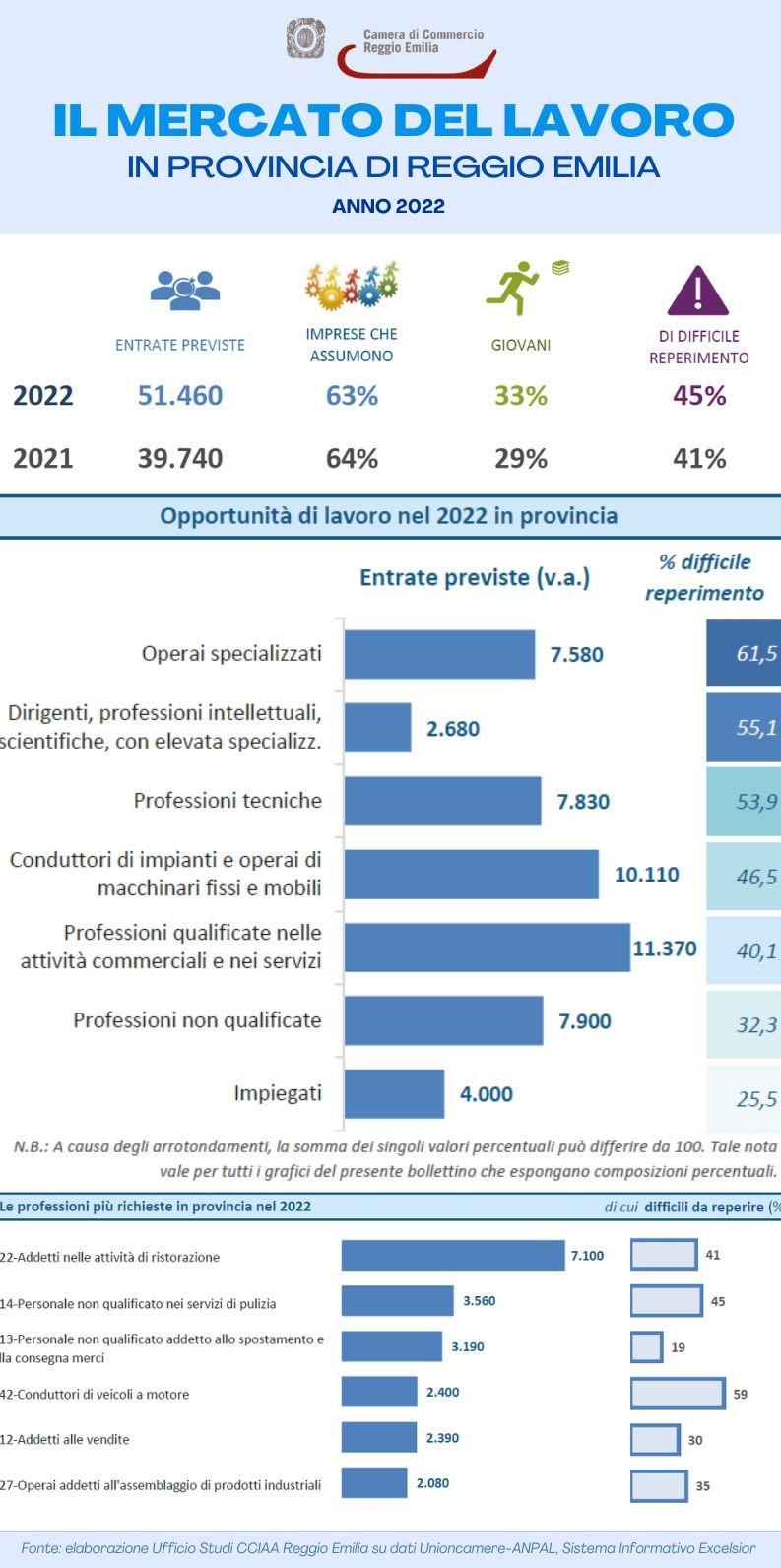 Nello specifico, i settori provinciali con maggiori difficoltà di reperimento sono stati quello delle costruzioni (difficile reperimento nel 61% dei casi, più della metà per mancanza di candidati), sanità, assistenza sociale e servizi sanitari privati (nel 57% dei casi, di cui il 46% per mancanza di candidati), le industrie metallurgiche e dei prodotti in metallo (52%), servizi operativi di supporto alle imprese e alle persone ( 48%), industria fabbricazione macchinari e attrezzature e dei mezzi di trasporto (48%). Le figure professionali che sono state di più difficile reperimento da parte delle imprese della nostra provincia nel 2022 sono state quelle relative a operai specializzati, con 7.580 entrate previste, in sei casi su dieci di difficile reperimento, seguiti da dirigenti, professioni intellettuali scientifiche, con elevata specializzazione (2.680 new entry con difficoltà di reperimento pari alla metà dei casi), professioni tecniche con 7.830 assunzioni con difficoltà di reperimento pari al 53,9% delle figure, conduttori di impianti e operai di macchinari fissi e mobili (10.110 nuovi ingressi a fronte di un 46,5% di casi “difficili”), professioni qualificate nelle attività commerciali e nei servizi (11.370 assunzioni, di difficile reperimento nel 40% dei casi), impiegati con 4.000 assunzioni, una su quattro difficile da trovare sul mercato del lavoro. Si è dunque confermato, in incremento, il permanere di uno scollamento tra formazione e mondo produttivo.