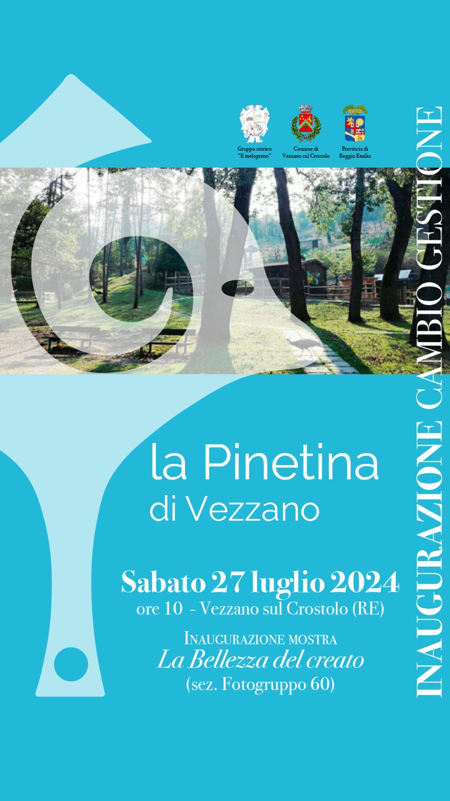 Sabato 27 luglio alle ore 10 verrà inaugurata la nuova gestione della Pinetina di Vezzano sul Crostolo. E’ il Gruppo Storico Folkloristico il Melograno che si è aggiudicato la nuova gestione del luogo situato nella primissima collina reggiana e che apre le porte all’Appennino a chi arriva dalla città. Con la Pinetina di Vezzano si articolata ulteriormente la serie di presidi culturali seguiti dal sodalizio carpinetano che parte dal Castello di Bianello per arrivare al Centro Laudato Sì della Pietra di Bismantova passando per il Castello di Sarzano e il Castello di Carpineti.