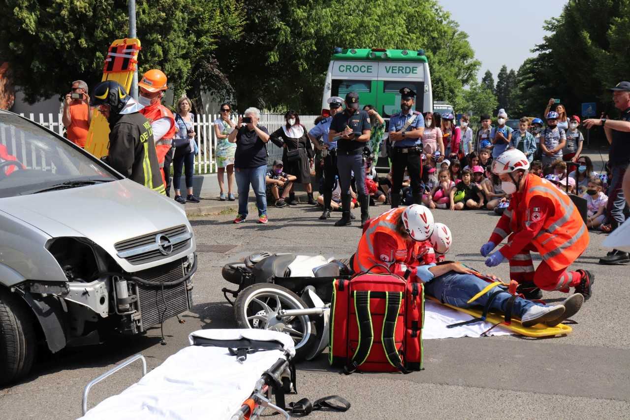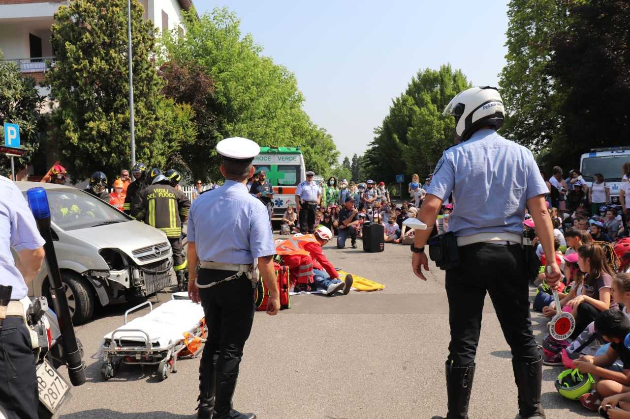 Ogni classe, dopo una breve lezione sulla segnaletica stradale, è stata accompagnata dagli agenti della Polizia locale in un giro all’interno delle piste ciclabili del parco. Da oltre vent’anni, infatti, l’area verde del Carrozzone allestita per essere un parco educativo, può contare su un percorso dove rotatorie, sensi unici, segnali stradali e attraversamenti riproducono tutto ciò che i piccoli utenti incontrano sulla strada. Particolare interesse ha suscitato la simulazione di un incidente stradale tra un’auto e uno scooter: pur vivendolo come un gioco, trattandosi appunto di finzione, i bambini hanno potuto verificare passo a passo tutte le fasi dell’intervento durante un incidente stradale, dal primo soccorso all’intervento dei vigili del fuoco, fino al rilievo del sinistro condotto da forze di polizia e carabinieri.