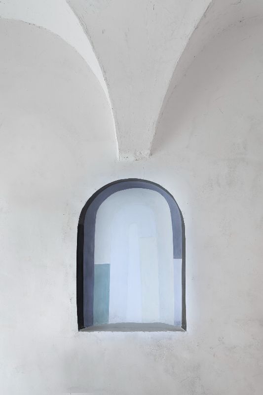 L’artista ha inoltre realizzato un prezioso intervento permanente dal titolo Interno nel complesso monumentale di San Pietro: un piccolo wall drawing con pastelli strofinati a mano sulla parete in una nicchia, all’interno della Sala delle Colonne. Le sue linee incorniciano e seguono l’andamento della superficie, i colori graduano dai grigi ai verdi salvia e bosco creando uno sfondamento virtuale della stanza. “Interno – afferma Marina Dacci – è una entrata mistica che apre uno spiraglio verso l’altrove”.