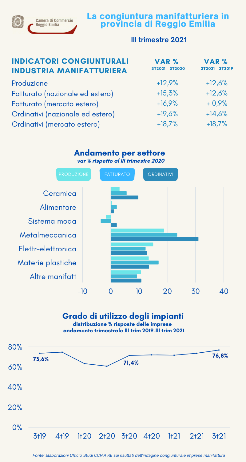 I comparti che fanno registrare crescite della produzione superiori alla media sono la metalmeccanica (+18,8% rispetto al trimestre luglio-settembre 2020), le industrie elettriche/elettroniche (+15%) e le materie plastiche (+13,4%); un po’ meno brillanti le performances delle altre attività manifatturiere (+10,7%), del settore ceramico (+3,1% dopo l’incremento record del secondo trimestre 2021, con un +25,2%) e del comparto alimentare (+0,4%), che era comunque tra quelli che meno avevano perso a causa della pandemia.
