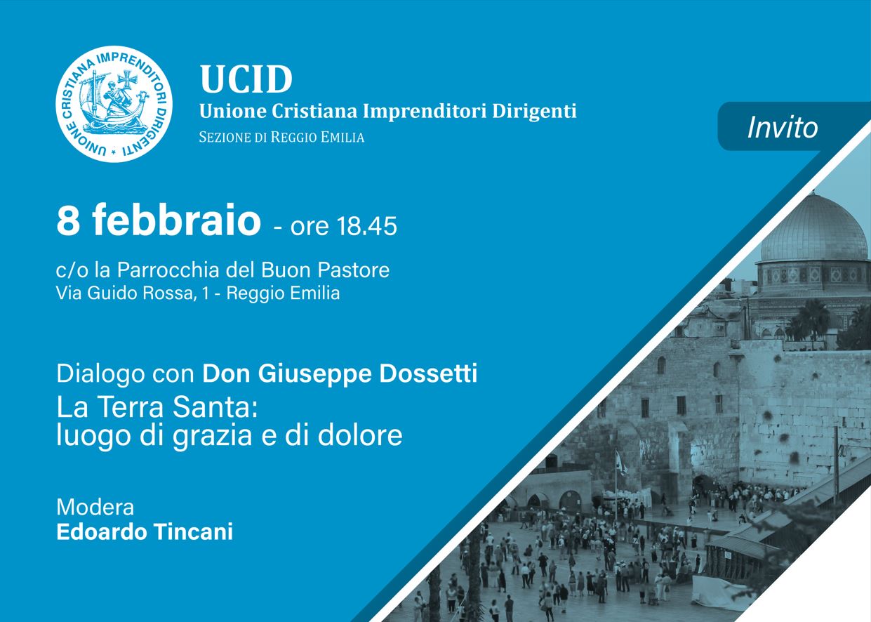 La sezione Ucid di Reggio Emilia (Unione cristiana imprenditori e dirigenti) organizza un incontro, gratuito e aperto al pubblico, giovedì 8 febbraio, alle ore 18.45, presso la Parrocchia del Buon Pastore a Reggio Emilia (via Guido Rossa 1), dal titolo “Terra Santa: luogo di grazia e di dolore”.