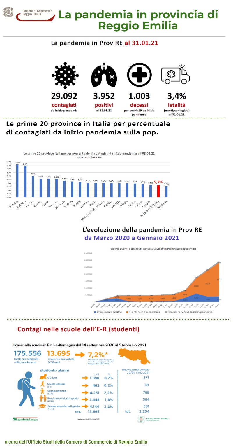 Sanità. Il Rapporto della Camera di Commercio evidenzia che Reggio Emilia è stata – sia nella prima che nella seconda ondata del virus – tra le prime province come numero di contagi. Da marzo 2020 a gennaio 2021 sono, infatti, quasi 5.500 ogni 100 mila abitanti i positivi della provincia di Reggio Emilia rispetto ai circa 4.900 dell’Emilia-Romagna e ai poco più di 4.200 dell’Italia.