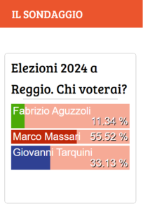 Si è concluso alle 15 il nostro primo sondaggio sulle intenzioni di voto alle amministrative di giugno a Reggio Emilia. Oltre un migliaio i voti espressi dal 6 marzo scorso, con una netta affermazione del candidato del centrosinistra Marco Massari, che ha ottenuto – almeno tra i nostri lettori – il 55,5% dei consensi, staccando nettamente il candidato del centrodestra Giovanni Tarquini (33,1%) e Fabrizio Aguzzoli di Coalizione civica (11,4%). Una percentuale che, se confermata alle urne, eviterebbe il ballottaggio.