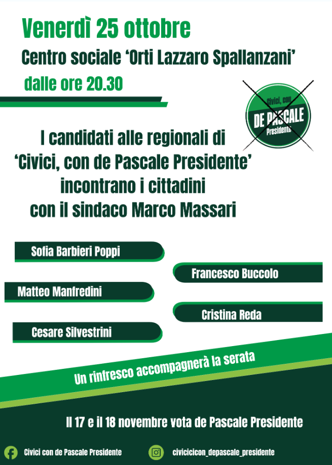 Venerdì 25, alle ore 20.30, presso la Casa di quartiere Orti Lazzaro Spallanzani saranno presentati i candidati per la lista ‘Civici, con de Pascale Presidente’.