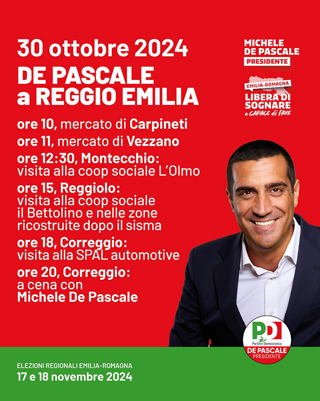 Mercoledì 30 ottobre sarà una giornata tutta reggiana per Michele de Pascale, candidato per il centrosinistra e civici alla presidenza della Regione Emilia Romagna. Prima tappa, la montagna reggiana: alle ore 10 de Pascale sarà al mercato di Carpineti assieme alle candidate e ai candidati del PD al consiglio regionale, ad amministratori e altri rappresentanti del territorio. Michele de Pascale si sposterà poi a Vezzano sul Crostolo per un altro momento in mezzo alle persone, sempre al mercato. A seguire il candidato alla presidenza della Regione andrà a visitare la coop sociale L’Olmo di Montecchio, storica realtà sociale impegnata nell’inserimento lavorativo per persone con diritti speciali situata nella val d’Enza, proprio per dare valore a questa modalità di lavoro tipica del nostro territorio.