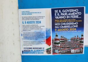 Le locandine della protesta sono affisse in bella vista negli stabilimenti, mentre gli altoparlanti scandiscono il messaggio che annuncia la mini-serrata di oggi, con gli ombrelloni aperti due ore più tardi del previsto, alle 9.30.
