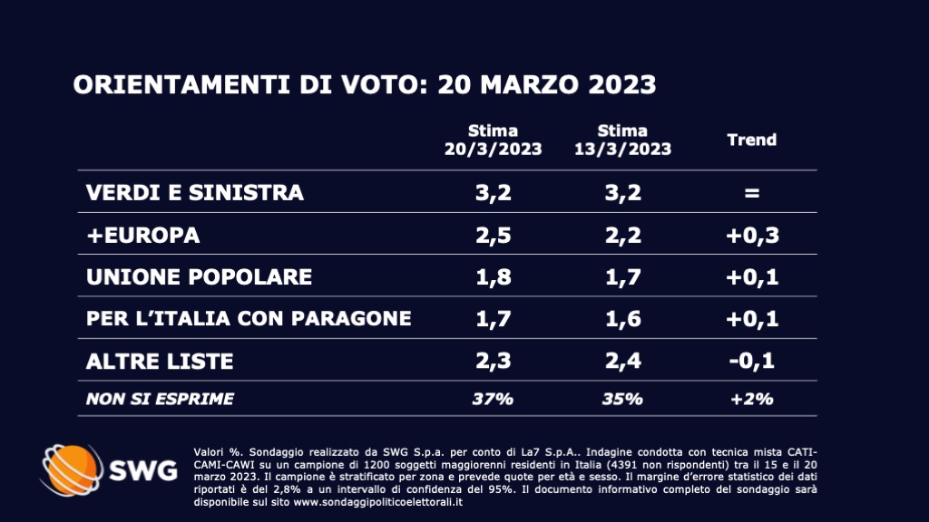 Stabile Verdi e Sinistra italiana al 3,2, guadagna lo 0,3% invece +Europa al 2,5. Unione popolare è all’1,8% (+0,1).