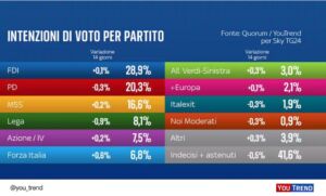 Nessun particolare scossone nelle intenzioni di voto da parte degli italiani per il sondaggio realizzato da Quorum/Youtrend per SkyTg24. Fratelli d’Italia si conferma al primo posto con il 28,9% (+ 0,1%), mentre – dopo la nomina della segreteria – perde lo 0,3%, il nuovo Pd di Elly Schlein che scende al 20,3%, mantenendosi però saldamente davanti al Movimento 5 Stelle (16,6%). Peggio di tutti la Lega (8,1%) che cede lo 0,9% a vantaggio di Forza Italia che avanza dello 0,6% al 6,8%. Curiosamente – nella settimana che ha sancito la rottura tra Calenda e Renzi – il cosiddetto terzo polo Azione/Italia Viva guadagna lo 0,2 e si porta al 7,5%. Più staccati Verdi-Sinistra al 3%, +Europa al 2,1%, Italexit all’1,9%, Noi Moderati allo 0,9%. Nel sondaggio – svolto con metodologia CAWI tra il 12 e il 13 aprile 2023 su un campione di 802 intervistati rappresentativi della popolazione maggiorenne residente in Italia – resta comunque alta la percentuale di indecisi e astenuti: 41,6%.