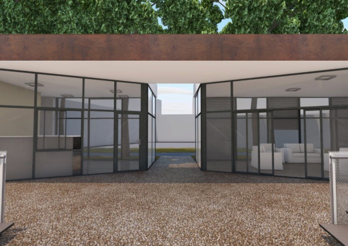 In accordo con la Soprintendenza e per il miglioramento generale del complesso, in grado di connotare meglio il teatro anche dall’esterno, il corpo scala esistente è stato ridisegnato con l’inserimento di un portale metallico a copertura del manufatto.
