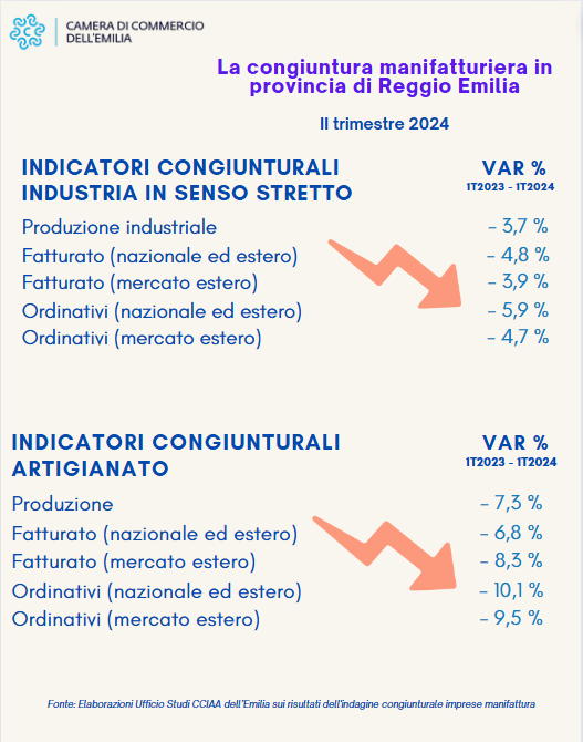 Si è chiuso in calo il secondo trimestre 2024 per la manifattura reggiana. A evidenziarlo sono le analisi dell’ufficio Studi e Statistica della Camera di commercio dell’Emilia sui risultati dell’indagine congiunturale del sistema camerale sulle piccole e medie imprese, che parlano di -3,7% per la produzione industriale in senso stretto rispetto allo stesso trimestre dell’anno precedente; il dato è peggiore di quello medio regionale, che evidenzia un calo del 2%.
