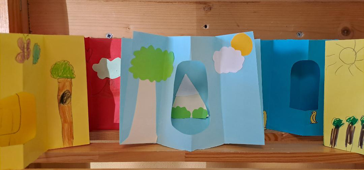 Il libro, inteso come strumento creativo, proposto in suoi diversi formati che tra pop up, pieghevoli, piccoli e colorati insiemi di pagine rilegate e decorate si presta a diverse interpretazioni e a diversi gradi di talento artistico, riavvicina il mondo immaginativo a un supporto concreto, fisico, tangibile e all’idea di una storia che si sviluppi in un ordine, o una sequenza, che per quanto inventata richiami l’uso delle potenzialità logiche e narrative. Dati quindi elementi “tecnici” e spiegati i passi necessari per ottenere un determinato risultato, si è lasciato ampio spazio interpretativo a ogni bambino e limitato il più possibile l’intervento dei maestri nelle parti risolutive, cioè creative, di ogni elaborato. Ognuno ha così realizzato libri di dimensioni molto piccole e diversificati, di classe in classe, per gradi di difficoltà e impegno richiesto ma di ognuno dei quali si è chiesto successivamente di raccontare perché fossero stati fatti in quel modo e cosa volessero raccontare. L’invito ripetuto è stato che si ripetessero i modelli proposti anche fuori dalle ore scolastiche e che l’osservazione della natura circostante fosse inclusa in queste esercitazioni.