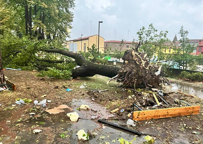Nel capoluogo estense il vento ha provocato anche la caduta di alberi sulle strade cittadine, ha scoperchiato alcuni pannelli e ha divelto qualche cartello stradale.